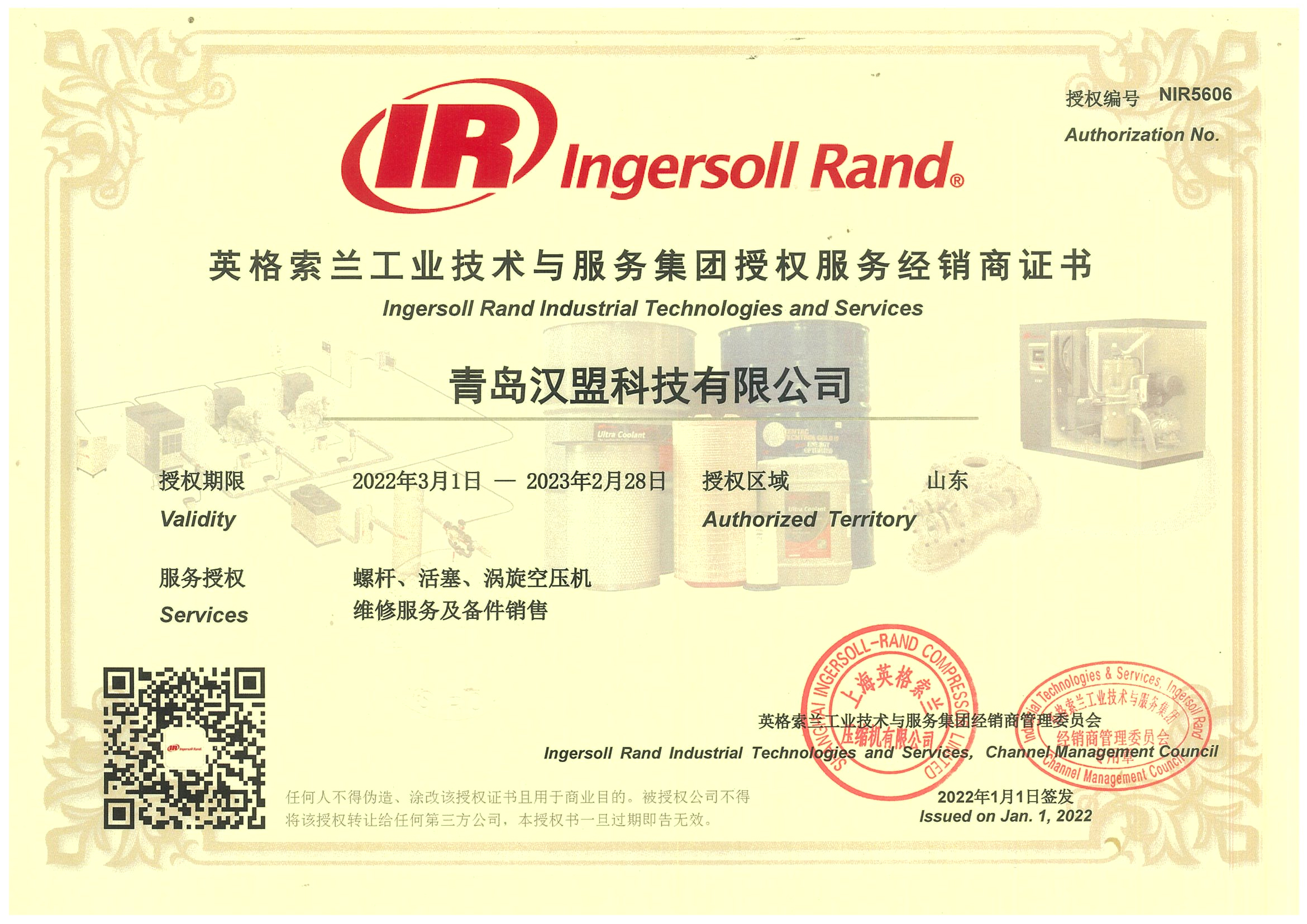 英格索兰工业技术授权经销商证书
