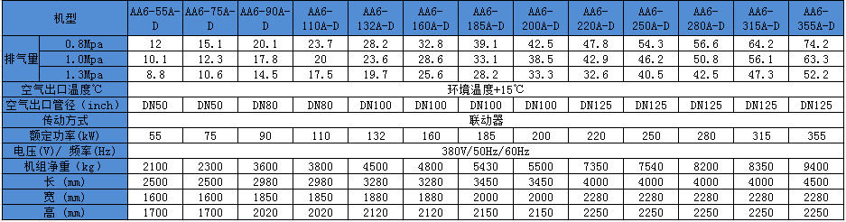 汉钟AA6螺杆空压机主要参数: